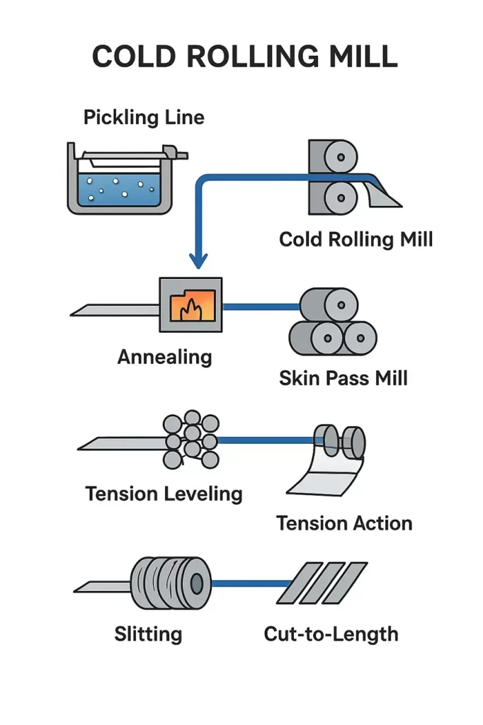 نورد سرد شامل TCM برای ورقهای نازک خودرو و لوازم خانگی، CRM برای ظرفیت متوسط و انعطافپذیر، SPM برای بهبود سطح و آمادهسازی قبل از پوششدهی، و Temper برای ورقهای ضخیمتر و ارتقای خواص مکانیکی است.